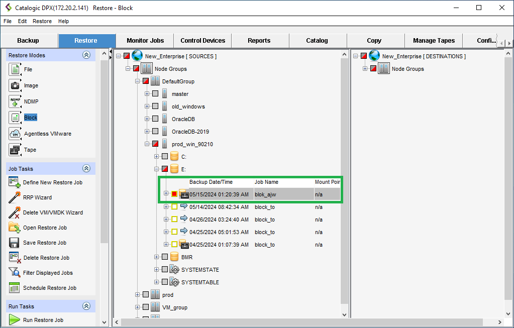 - Select the source (a previously created Block backup) and the destination for your restore job.