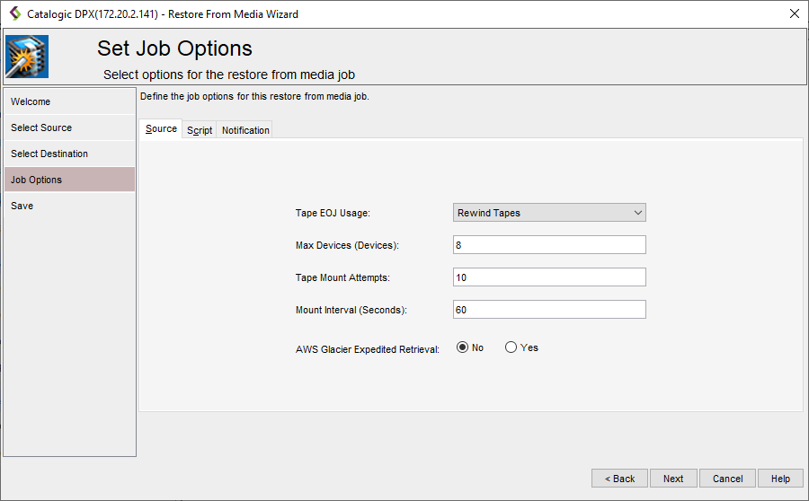 - In the Set Job Options step, define the job options for the archive restore job.