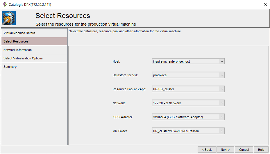 - In the Select Resources step, specify the Host, Datastore, Resource Pool/VApp, Network, iSCSI Adapter and the VM Folder where the new VM will be logically located. Click Next.