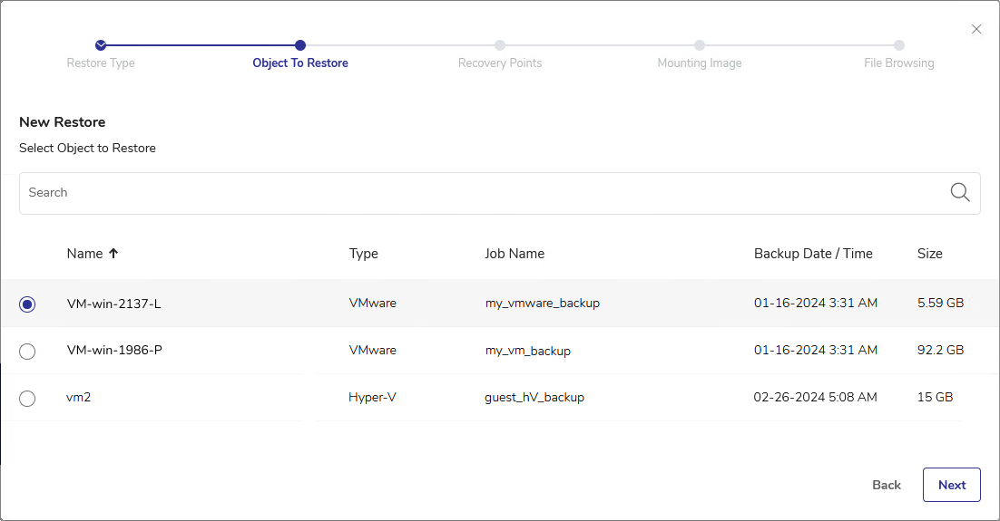 - The VM object list shows all VMs you backed up using the DPX Agentless Backup. The available objects to restore can be sorted by Name, Type, associated Job Name, the backup Date/Time, or by Size.