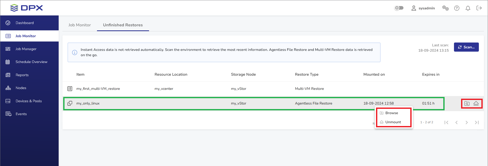 - When a mounting point is not necessary anymore, simply wait until it expires. Alternatively, click the Unmount button at the end of the Agentless File Restore mount or right-click the row and select Unmount from the drop-down menu (see above).