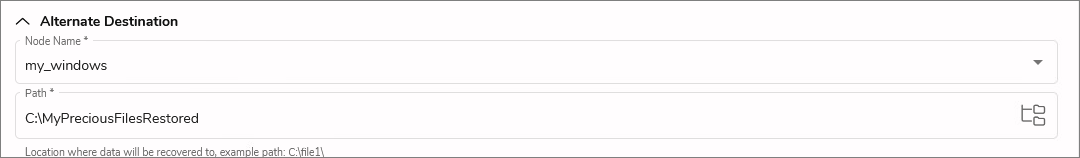 By default, DPX will restore the files or volumes specified in the File Browsing step to their original location. You may override this setting by indicating a directory on the same or another node.