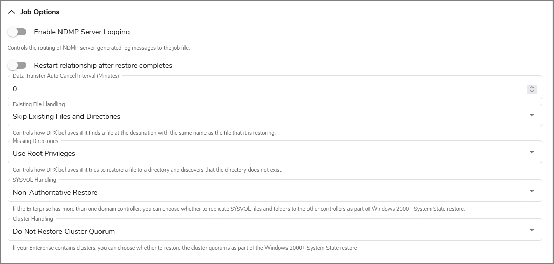 | Restore Cluster Quorum | DPX restores the cluster quorum. However, if other cluster nodes are active or if the cluster quorum has changed since backup, the cluster quorum restore may terminate. |