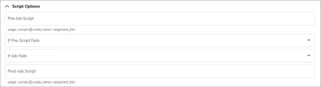 For detailed information about pre- and post-job scripts, including all valid definitions, see Pre-Scripts and Post-Scripts.