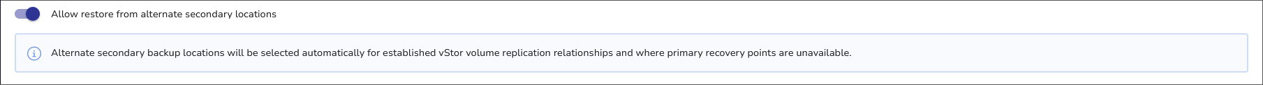 | Toggle on | Alternate secondary backup locations will be selected automatically for established vStor volume replication relationships and where primary recovery points are unavailable. |