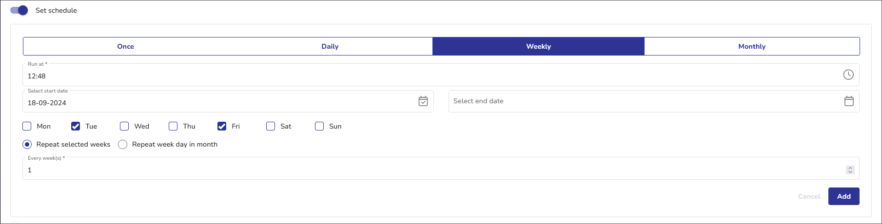 | Toggle on | Define one or more schedules to run the job. |