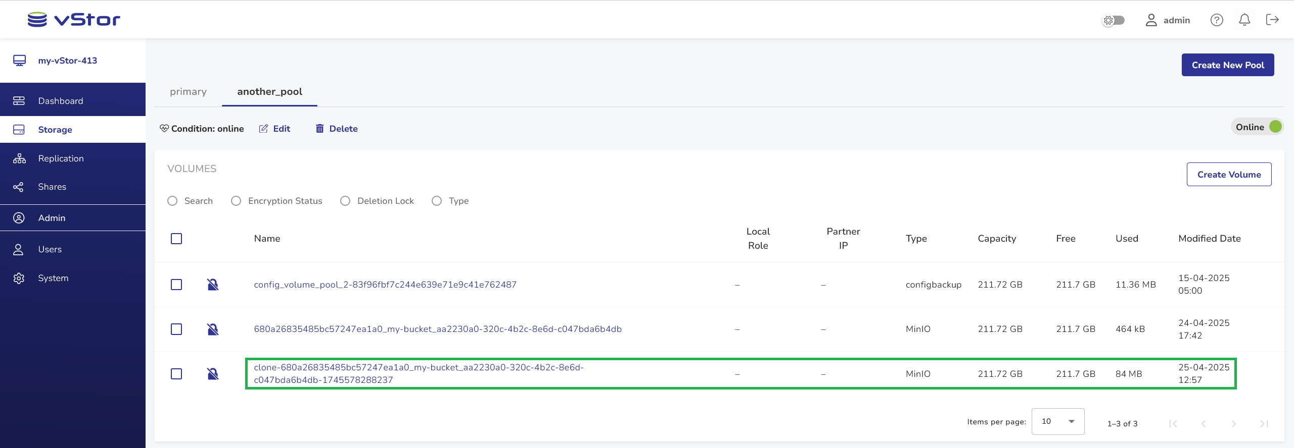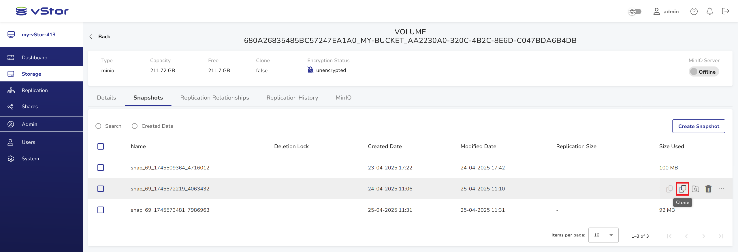 The default volume name consists of the original MinIO volume name with theclone-prefix and the UNIX timestamp suffix. You can edit the name before saving.