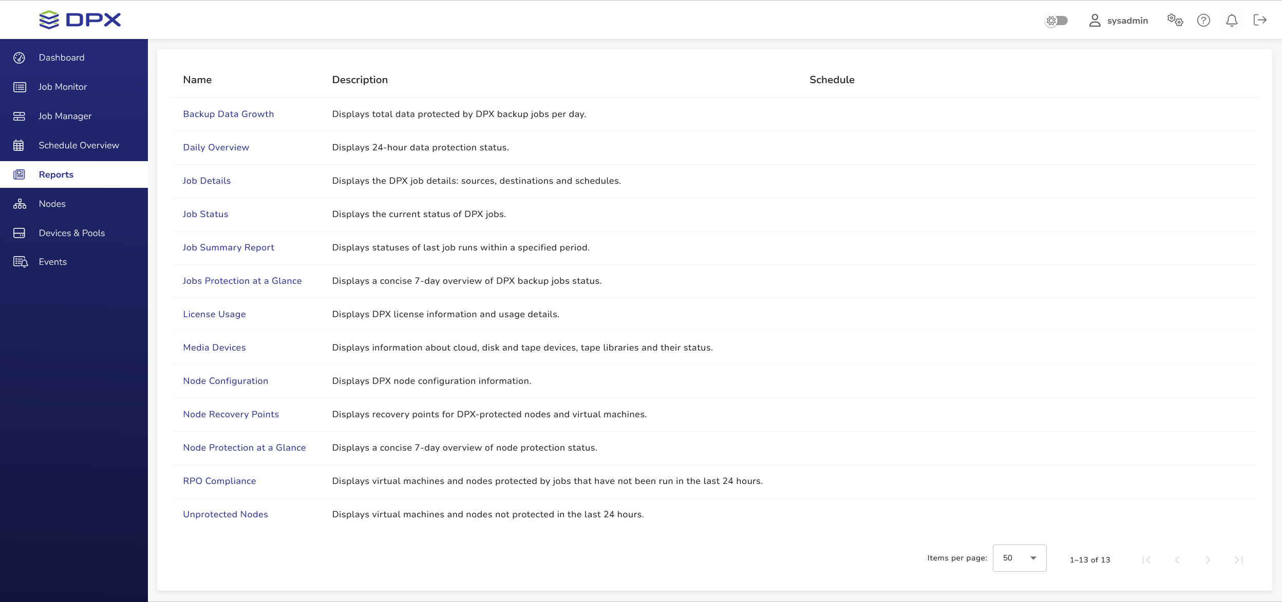 The list contains DPX report templates you can use to generate reports.