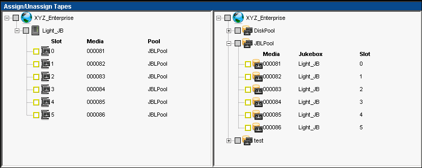 The Assign/Unassign Tapes window appears.Tape libraries are displayed in the left pane and media pools are displayed in the right pane.