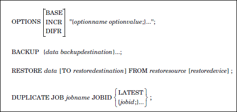 Here is a quick reference to the syntax of these statements. In the following sections, these statements are described in further detail. Here, brackets denote options and braces are used for logical groupings (the brackets and braces are not actually typed). The ellipses denote that the previous expression may be repeated.