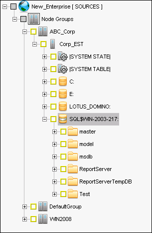 The individual databases appear as folders beneath the disks. The following shows a configuration where SQL$WIN-2003-217 is the default instance: