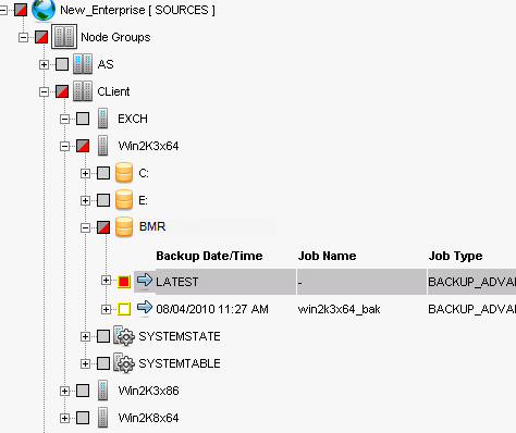 - In the Block Restore window, drill down to the BMR volume in the source pane and click on the plus sign to display all of the node’s snapshots.