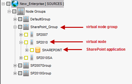 Due to the distributed architecture typically employed with SharePoint, DPX does not display the SharePoint application under the physical nodes that host the SharePoint installation. The SharePoint application appears in a virtual node, in a separate virtual node group called the SharePoint_Group.
