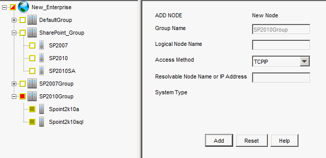 Because a node in an Enterprise is always a member of a group, add new SharePoint physical nodes to the Enterprise using a specific node group association. Although it is not specifically required, it is recommended that you use the management console to create a new dedicated SharePoint physical node group for the SharePoint application. For instructions on adding a node group to the Enterprise, see Adding a Node in the Reference Guide.