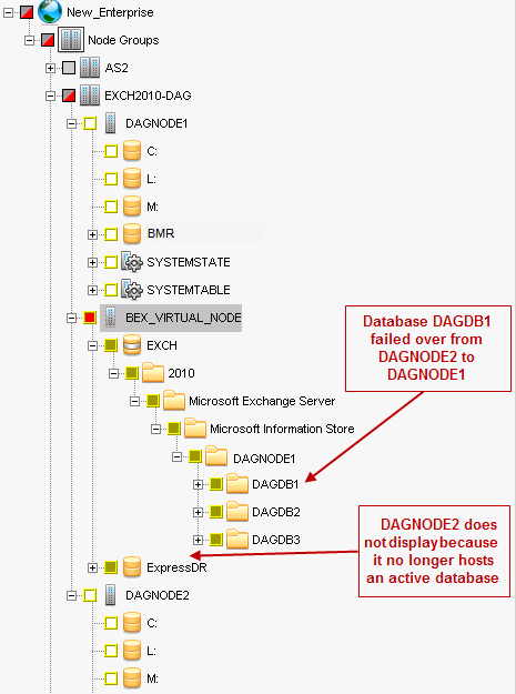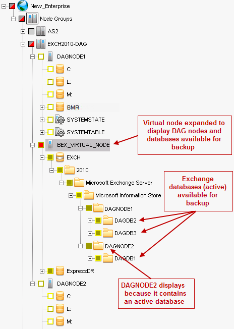 - In the case of a DAG, expand the virtual node to display the Exchange disk and expand further to display nodes in the DAG and their mailboxes. Nodes in a DAG are always backed up through the virtual node. Only active Exchange databases in a DAG display for backup. And only DAG nodes that contain an active database display.