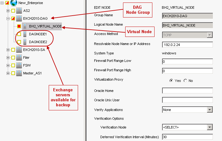 The following example shows nodes in the node group named EXCH2010_DAG. The virtual node BH2_VIRTUAL NODE is selected, and its node information is displayed in the EDIT NODE pane on the right. DAGNODE1 and DAGNODE2 are physical nodes in the node group.