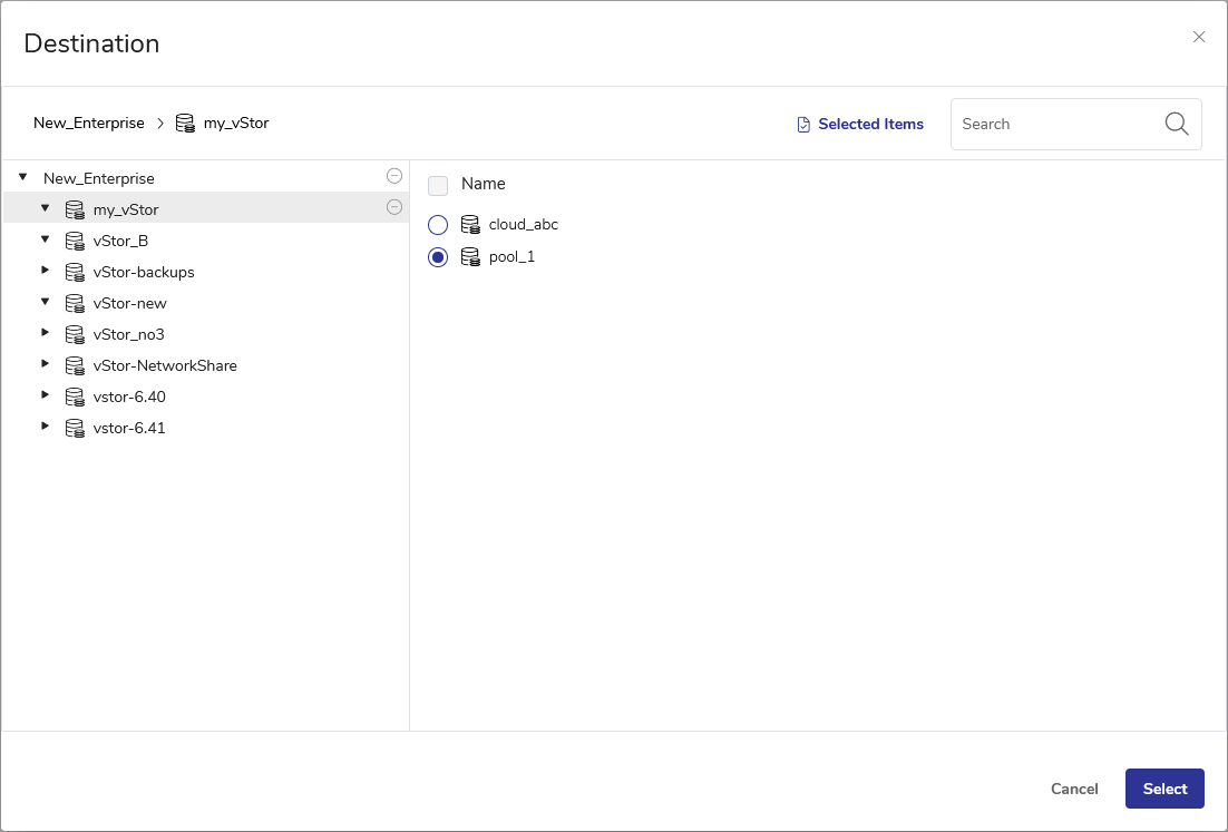 Choose vStor destination at the pool level. DPX will automatically create a separate volume in the selected pool for each source Hyper-V virtual machine.