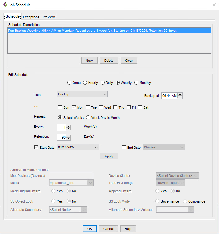 1. Select all required parameters, such as the schedule starting time and date, day of the week (if applicable), repetition period, backup retention time, etc.