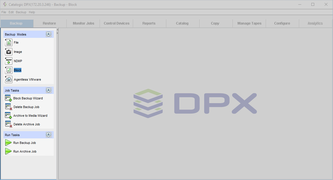 The title of the function window appears in the title bar, along with the name of the master server (shown in parentheses) and the name of the currently active view, e.g. Backup - Block - <block backup job name>.