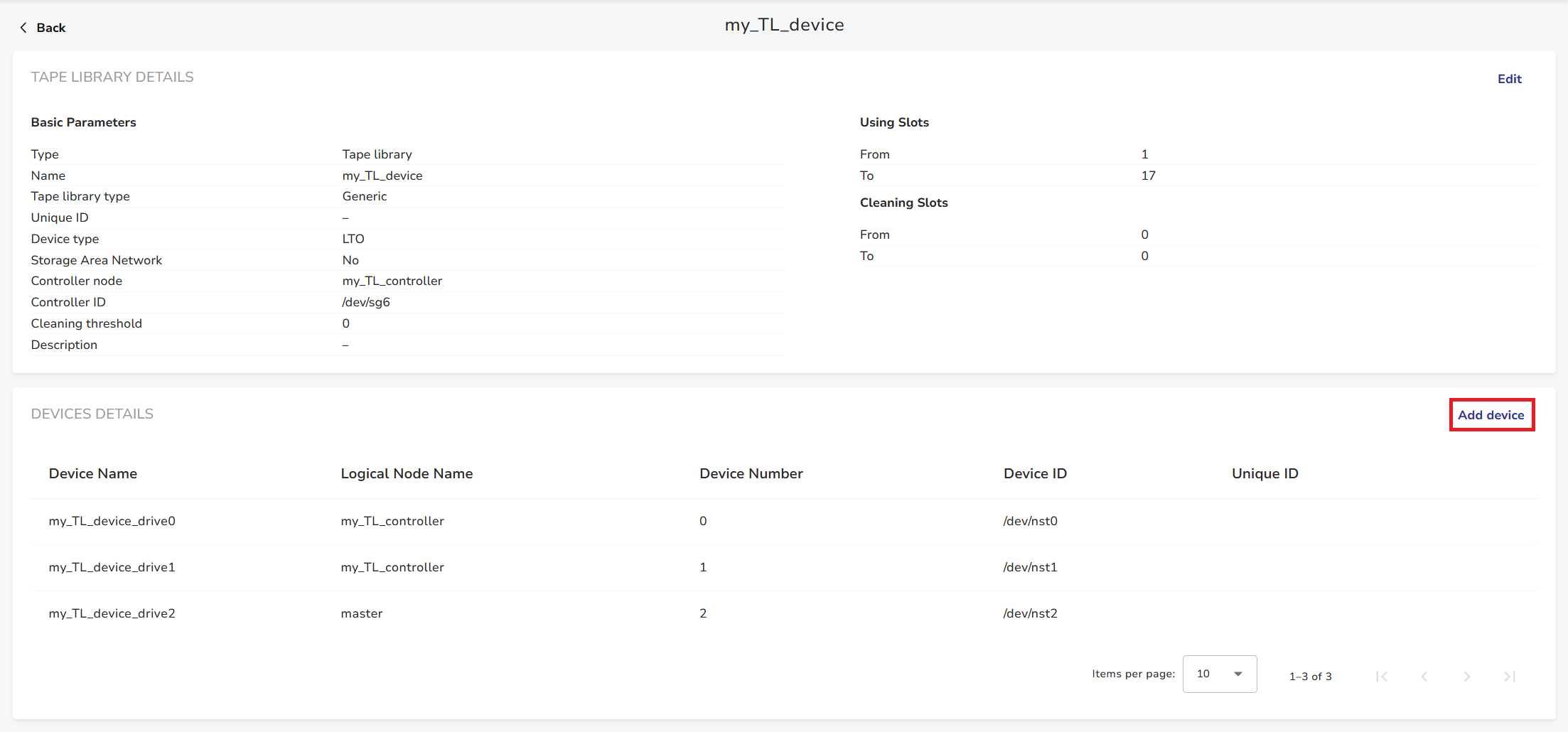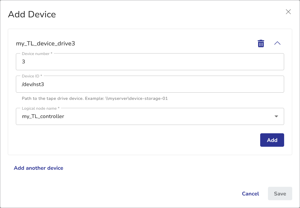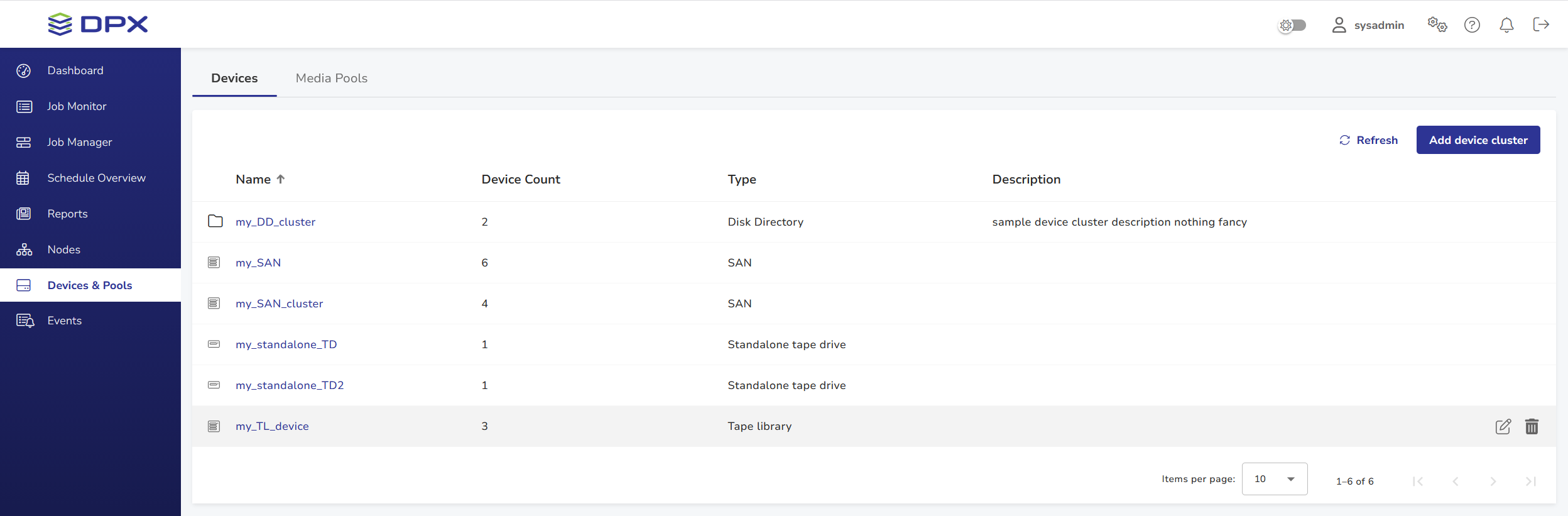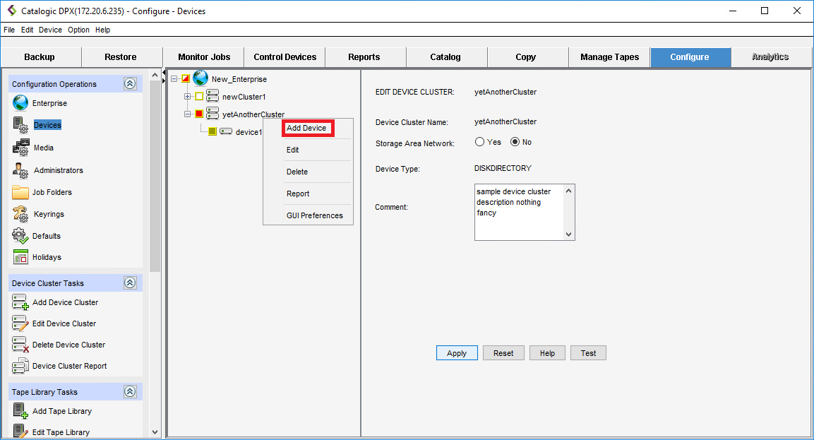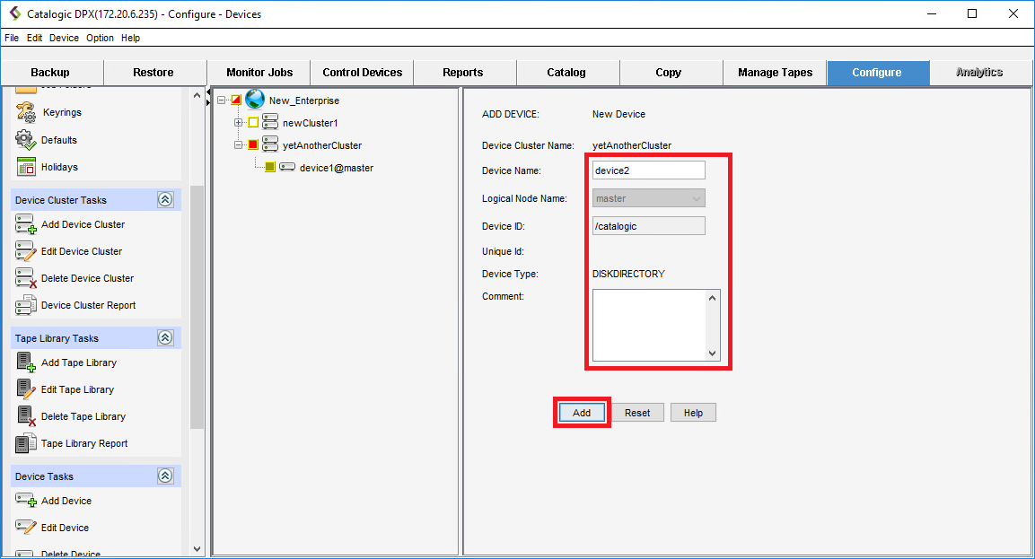 For Disk Directory devices, adding more devices to a device cluster is not required, as devices perform only a logical function in backup and restore operations. For tape devices, the device cluster includes physical devices available for backup and restore operations within the cluster. See Adding a Tape Library Device for details.
