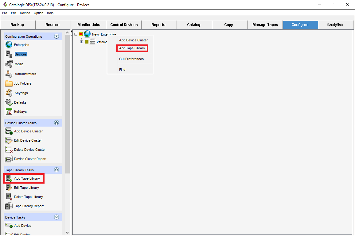 2. Click the Configure device button in the Devices Configuration section to configure tape drives within the tape library.
