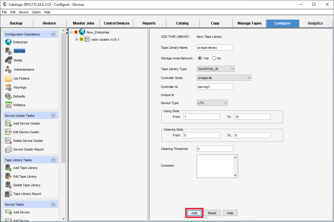 4. Click Save. Your tape device cluster is now added to the DPX Master Server.