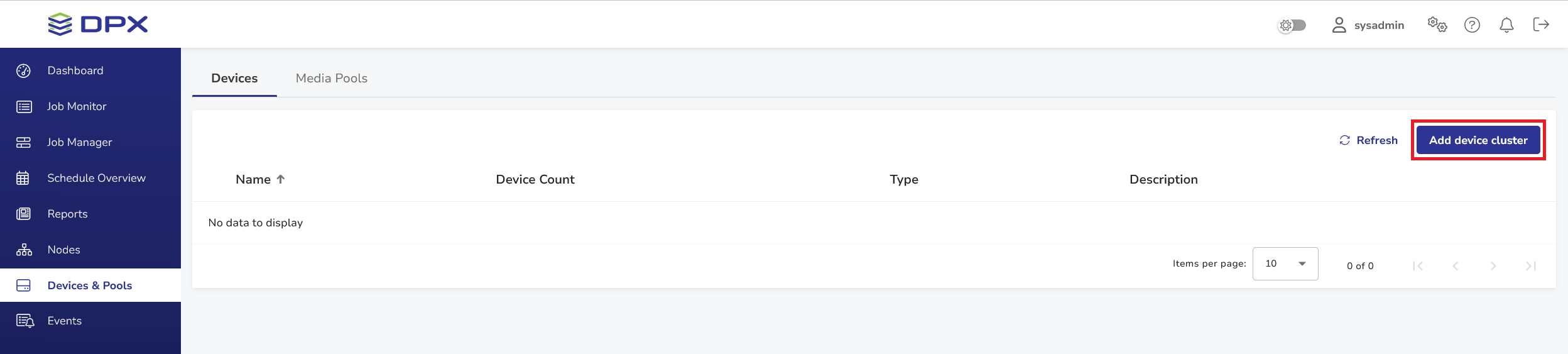 1. Go to Devices & Pools in the sidebar. Then select the Add device cluster button in the upper right corner to open the Add Device Cluster dialog.