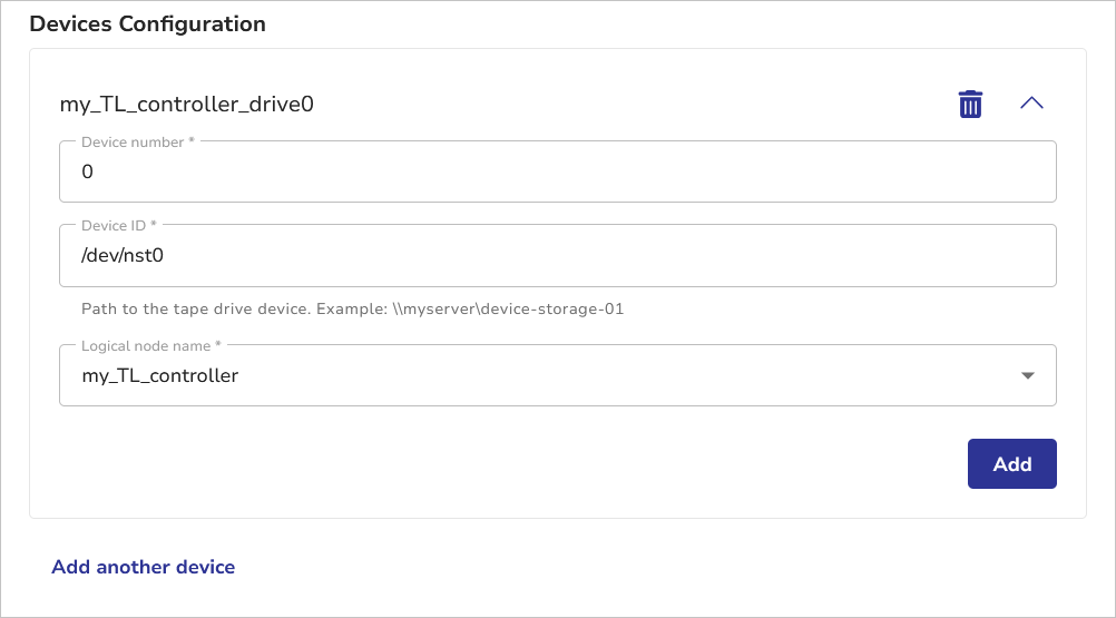 • Device type. Select a device type from the dropdown menu. All devices in a tape library must be the same type.