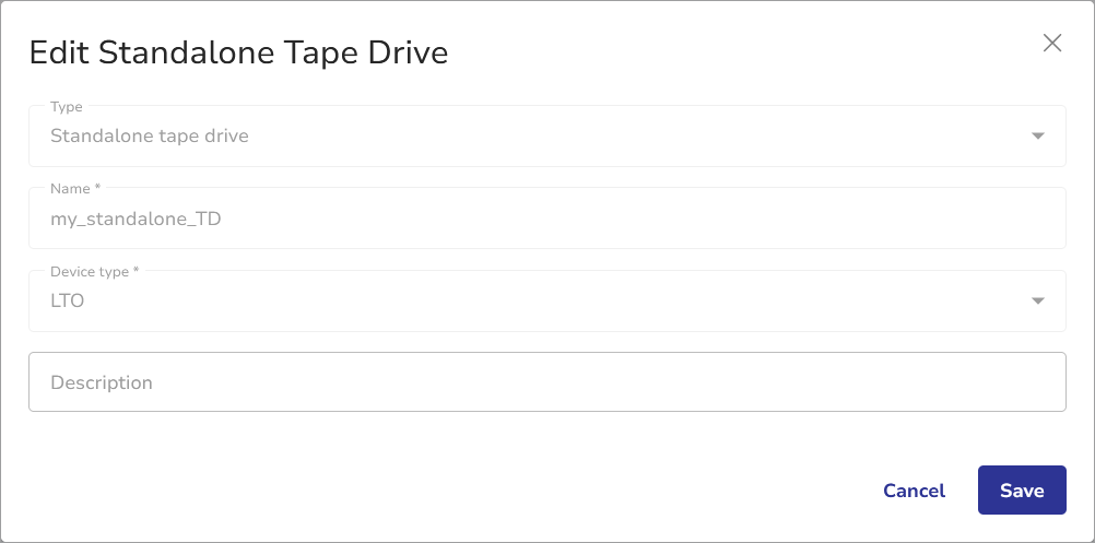 Hover over a standalone tape drive, right-click to open the context menu, and select Edit to launch the Edit Standalone Tape Drive dialog window.