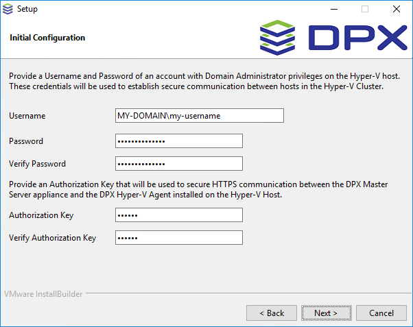 Particular attention must be paid when providing credentials for the Hyper-V host, as the Installation wizard does not verify the credentials. As a result, even though the installation may seem successful, invalid credentials will prevent the DPX Hyper-V Agent service from installing, thus making the Hyper-V host unusable.