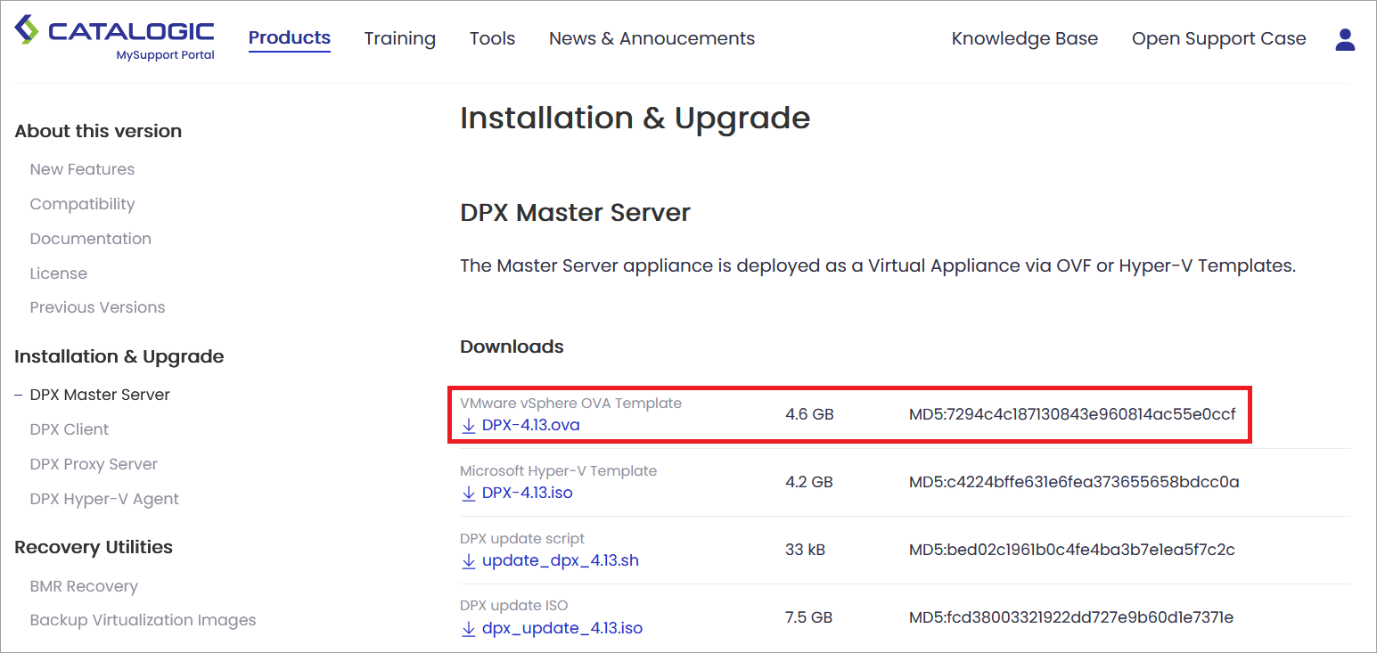 - Download the .OVA file from the Catalogic MySupport page: