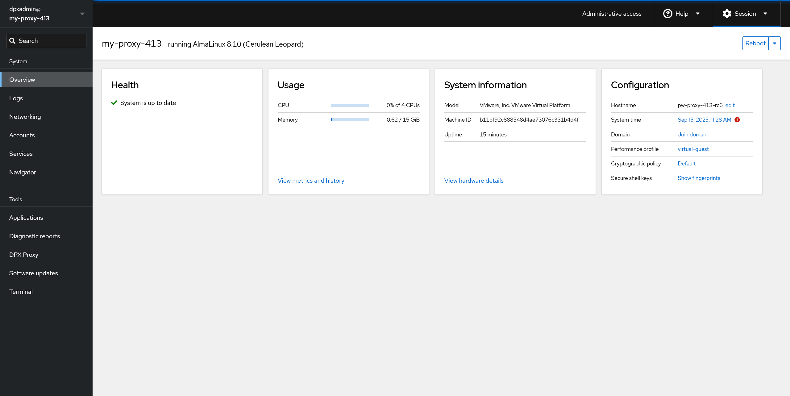 In most cases, you can access the Linux shell of the DPX Proxy Server from your web browser. Log in to the web interface as instructed in the Connecting to the DPX Proxy Server Web Interface and select Terminal from the side panel.