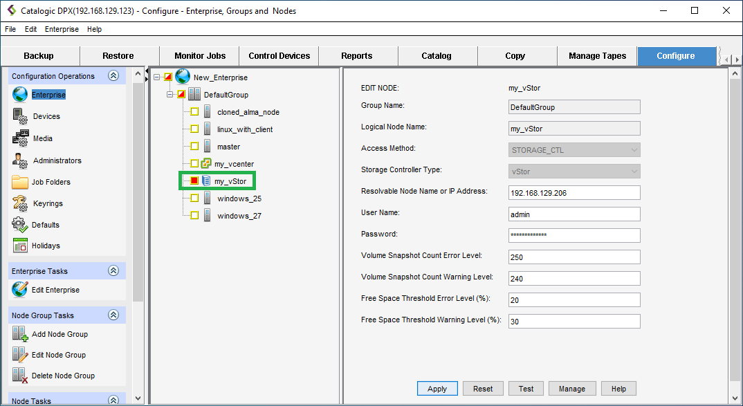 - Click Add. The vStor storage node is now added to your Enterprise and the newly added node is selected for edit.