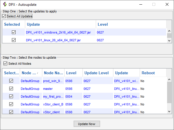 1. In the Autoupdate dialog, you can see a list of all available software update packages and a list of applicable nodes, including the DPX Master Server, with checkboxes. By default, all nodes are selected to update. You can clear any checkboxes to skip updating the systems. Click Update Now and follow the instructions in the dialog.