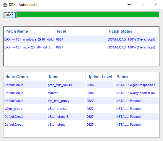 1. The Catalogic DPX Master Server automatically tests if it can update all nodes in its Enterprise. If the test succeeds, you will see another Autoupdate dialog.