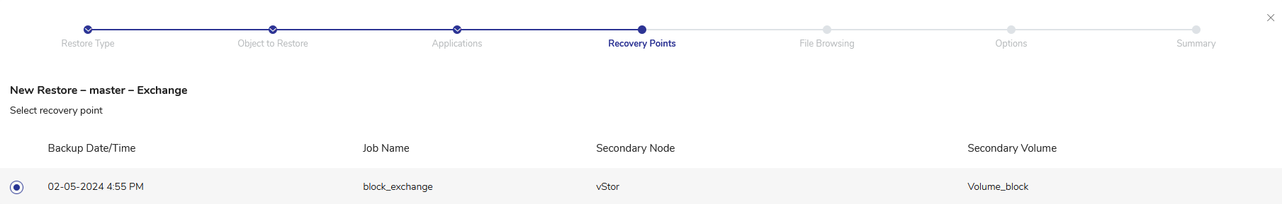 - Choose the appropriate recovery point from the available backups of the selected node.