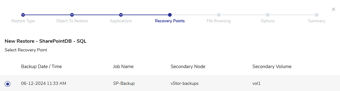- Choose the appropriate recovery point from the available backups of the selected node.