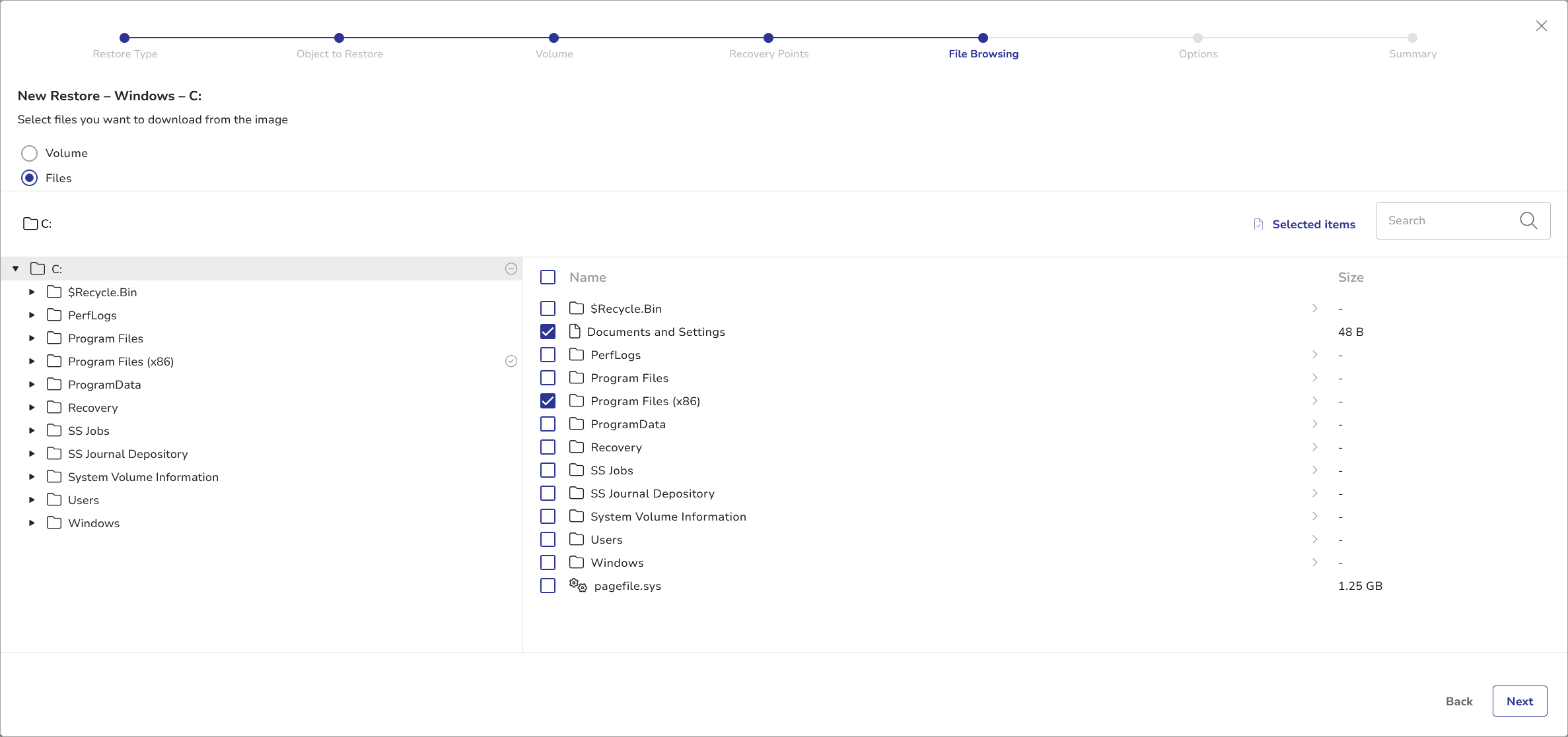 If you select Files, the file manager will appear, allowing you to select specific files for restore; click the volume label in the left-hand pane to display items within the volume.