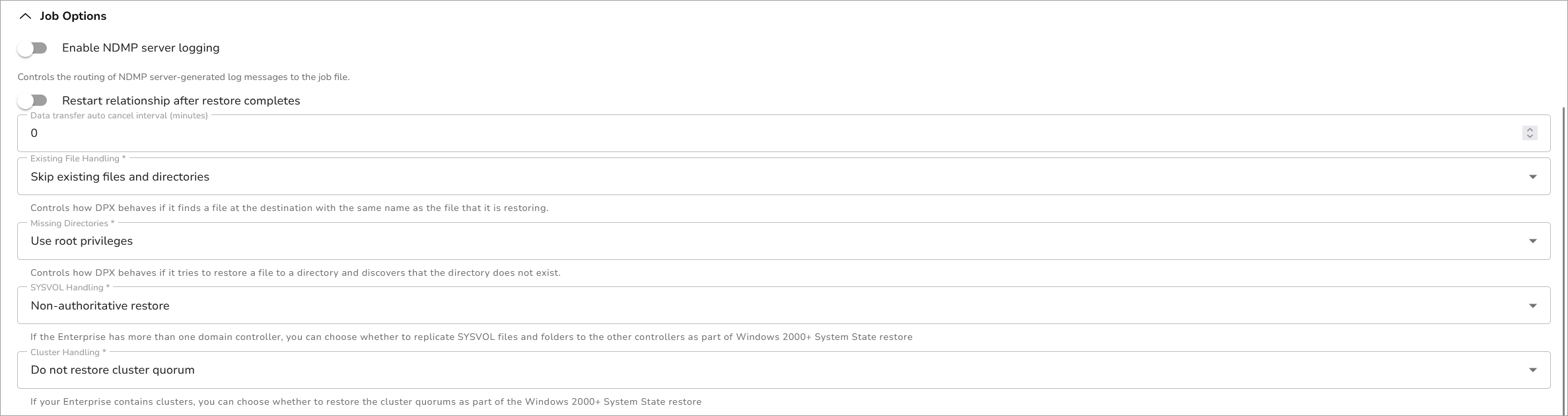 | Toggle on | All NDMP server log messages will be routed to the master server’s job log file. Yes is the default. |