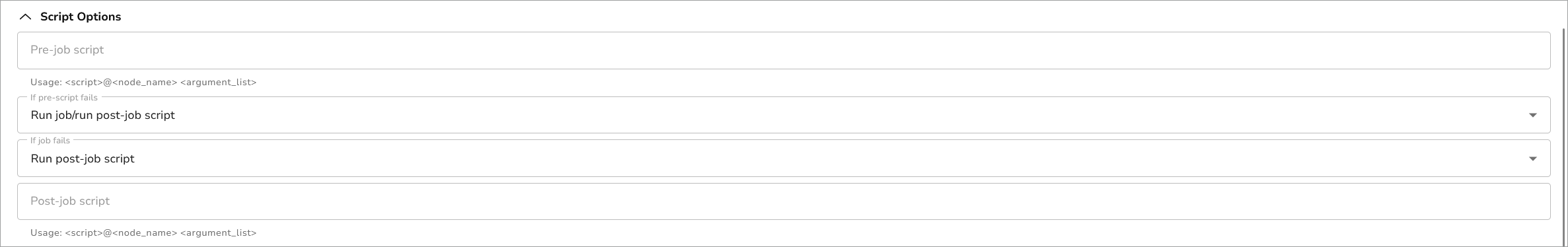 For detailed information about pre- and post-job scripts, including all valid definitions, see Pre-Scripts and Post-Scripts.