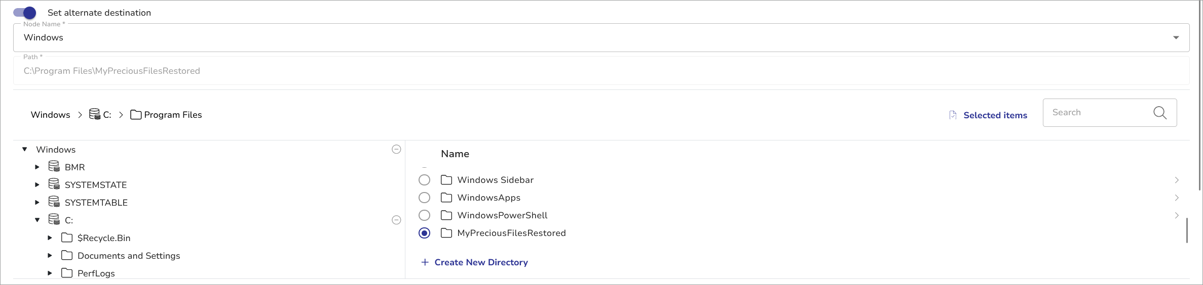 - Select the destination folder in the tree view. You can use the + Create New Directory button to restore data to a non-existing location; DPX will create it.