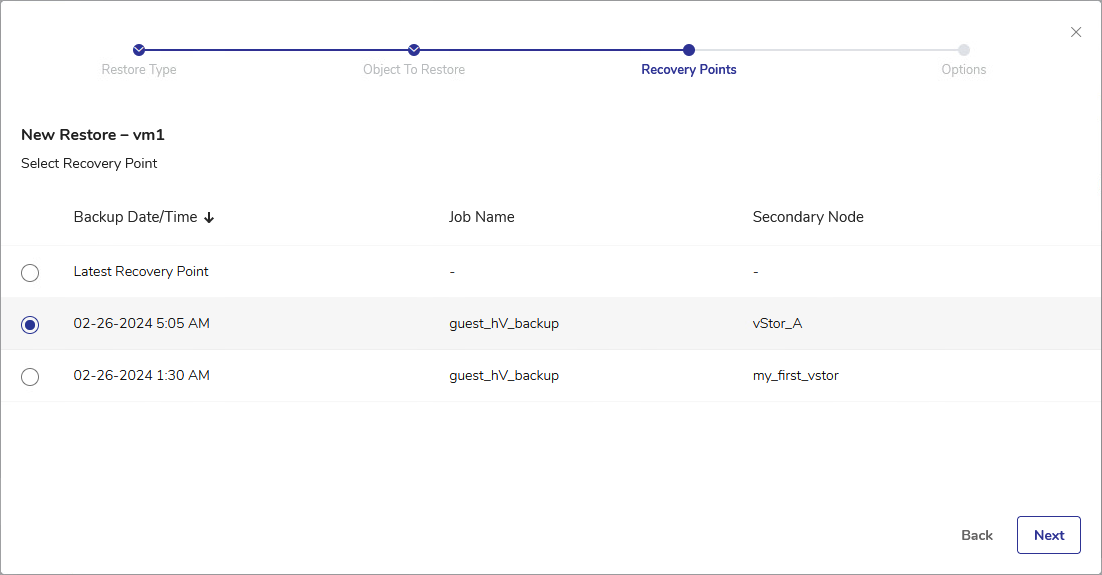The available recovery points can be sorted by Backup Date/Time, Job Name, or Secondary Node.