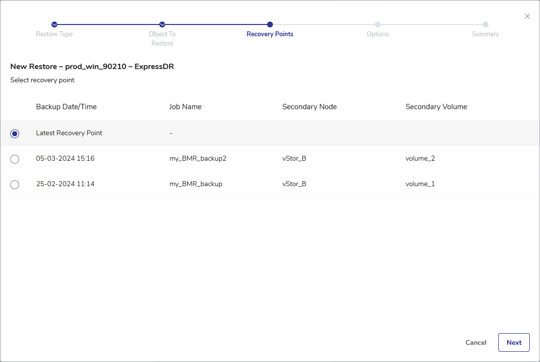 1. From the list of recovery points of the VM object, select the desired recovery point. By default, Latest Recovery Point is selected. Click Next.