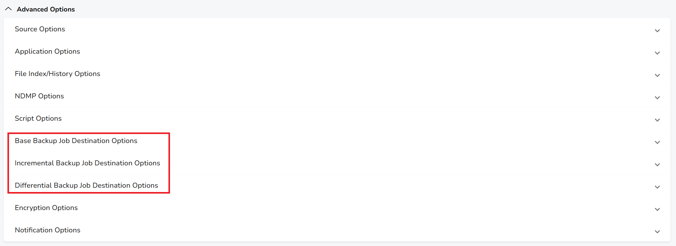 You can separately set destination options for base, incremental and differential backup in their relative tabs.