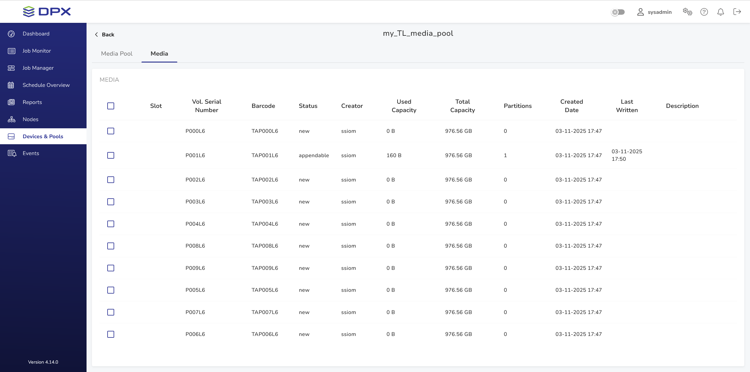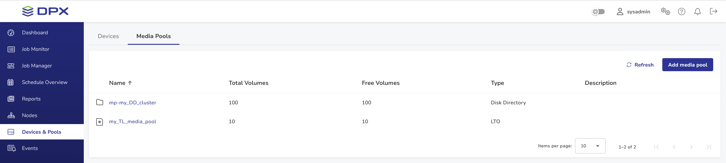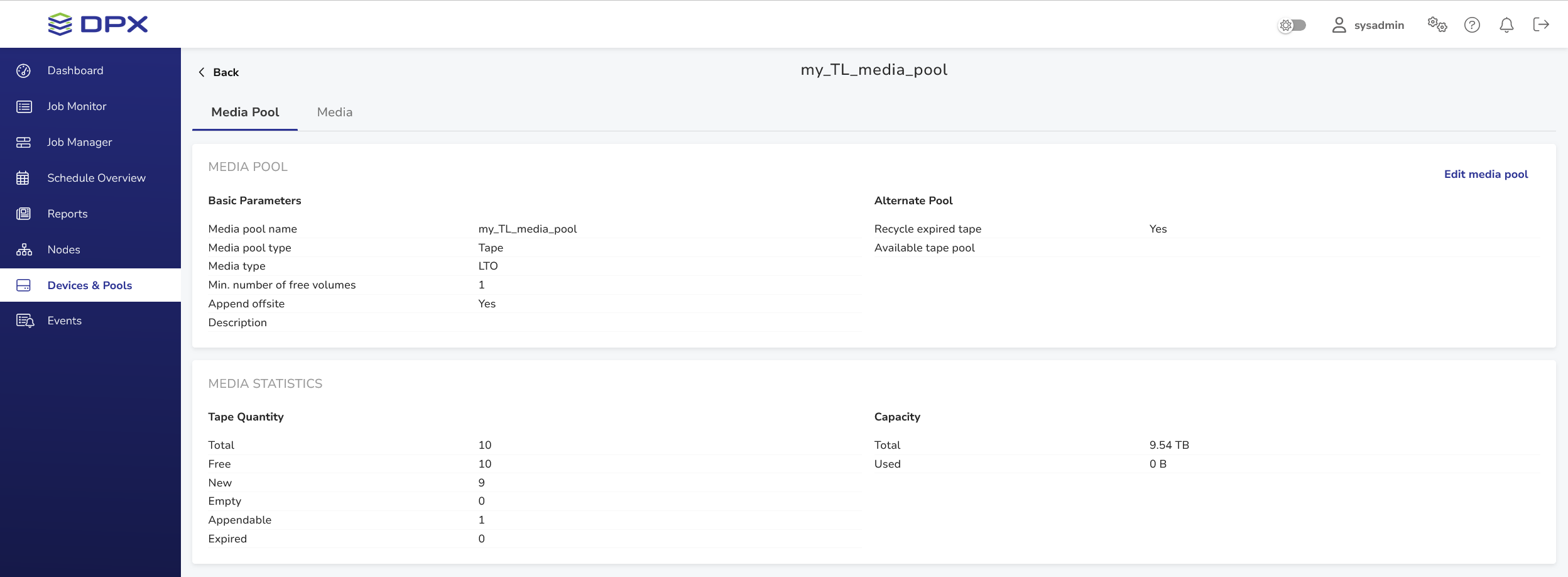 Below is a sample Media Pools view.