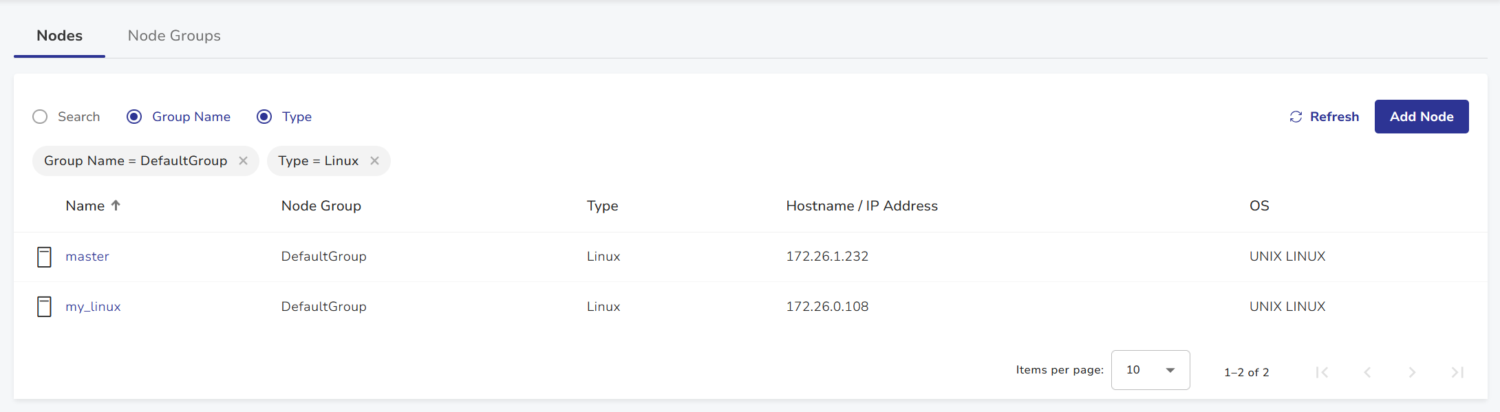 - Search filter allows filtering with a substring within any of the displayed attributes, such as Name, Node Group, Type, Hostname / IP Address, or OS. Wildcards are not supported.