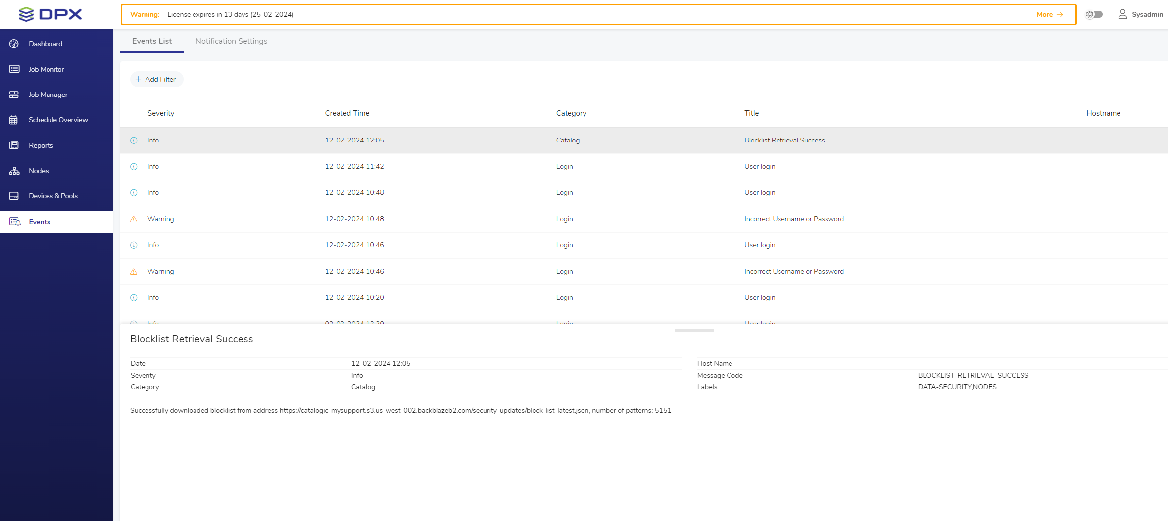 - Once the services are running again (this may take a few minutes), check the Events section in the DPX UI to verify that the blocklist has been downloaded.