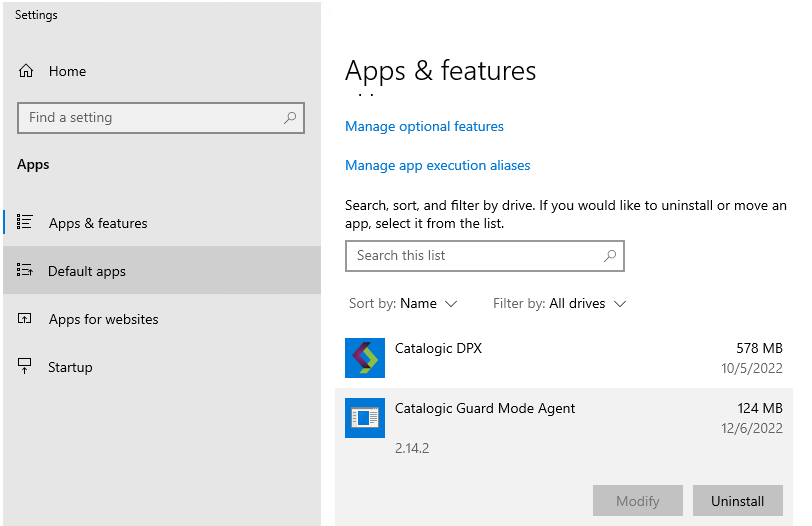 To uninstall GuardMode Agent the user can run the uninstall.exe located in the root folder or go to the Apps & features section of Windows settings:
