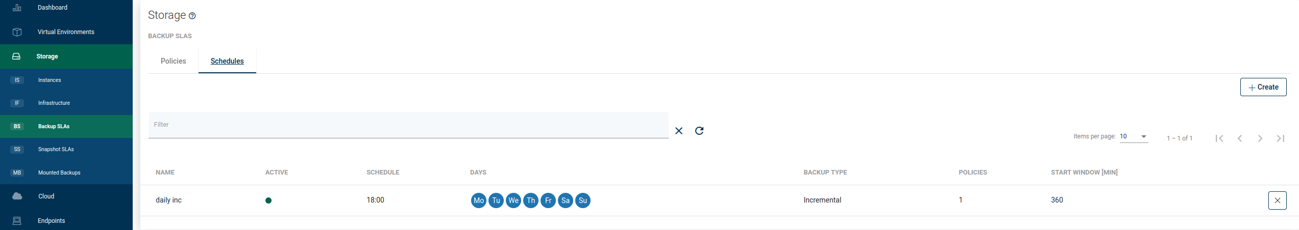 A schedule defines when and on which days instances should be backup. To define a new schedule, open Backup SLAs under the Storage section and go to the Schedules tab, then use the button.