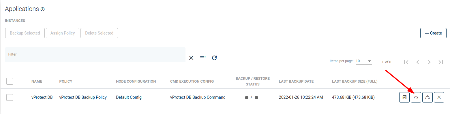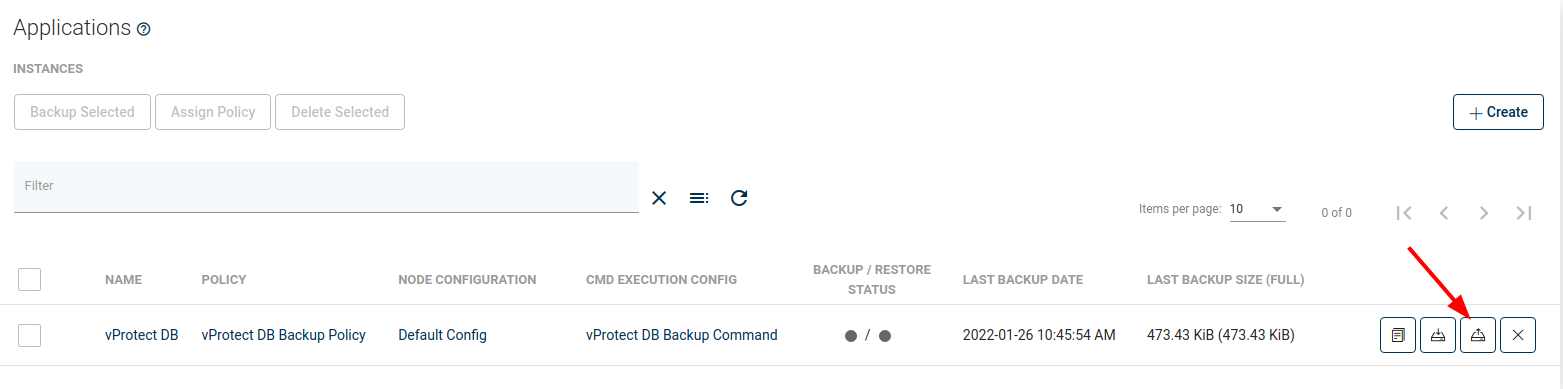 1. Search for the Application instance you want to back up and click Backup the button next to it.
